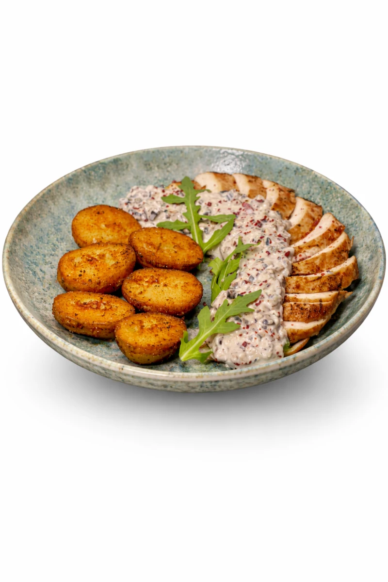 Нежное куриное филе, обжаренное до румяной корочки, подаётся с золотистым мини-картофелем. Дополняется сливочно-грибным соусом из шампиньонов, который придаёт блюду насыщенный вкус и аромат. Сытное и гармоничное блюдо для любителей мягких сливочных нот.
