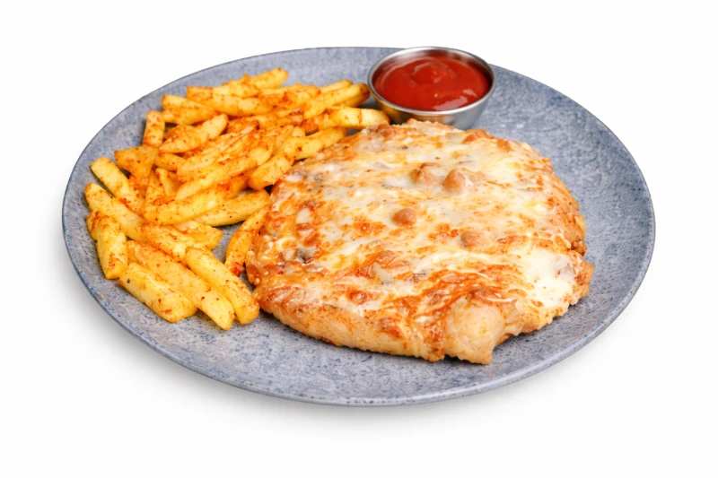Сочное куриное филе в золотистой хрустящей корочке, под нежной сырной шапкой из моцареллы с добавлением грецкого ореха. Подаётся с картофелем фри и томатным кетчупом.