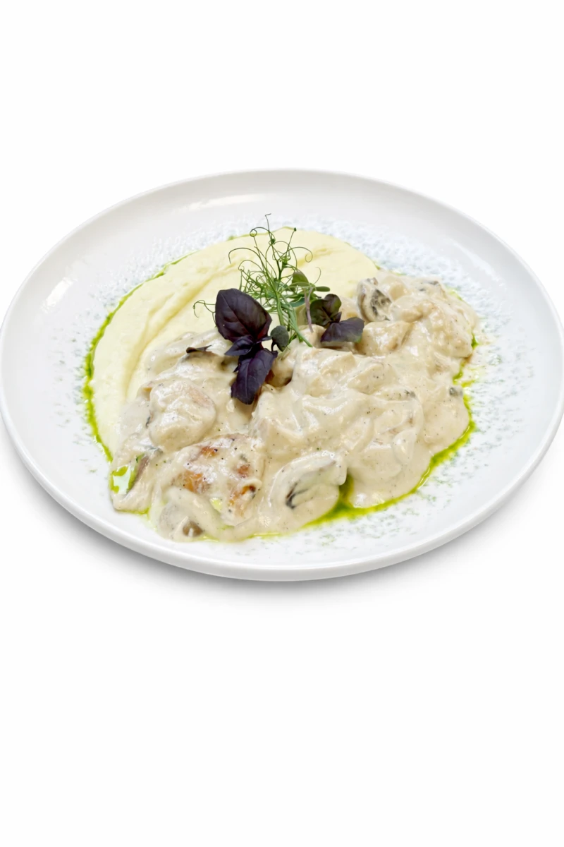 Нежное куриное филе, томлённое в сливочном соусе с шампиньонами и тянущейся моцареллой. Блюдо подаётся с воздушным картофельным пюре, которое идеально дополняет насыщенный сливочный вкус. Мягкое, согревающее и по-домашнему уютное блюдо — отличный выбор для сытного обеда или ужина.