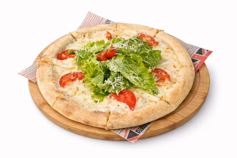 Нежная пицца с сочным куриным филе и тянущейся моцареллой на основе фирменного соуса Цезарь. После выпекания дополняется свежим миксом салата и спелыми томатами, что придаёт блюду лёгкость и свежий вкус.